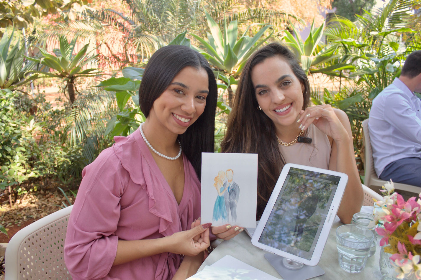 Além de ser uma experiência emocionante para os noivos, a pintura também se torna uma atração delicada para os convidados, que acompanham o processo artístico acontecendo ao vivo.